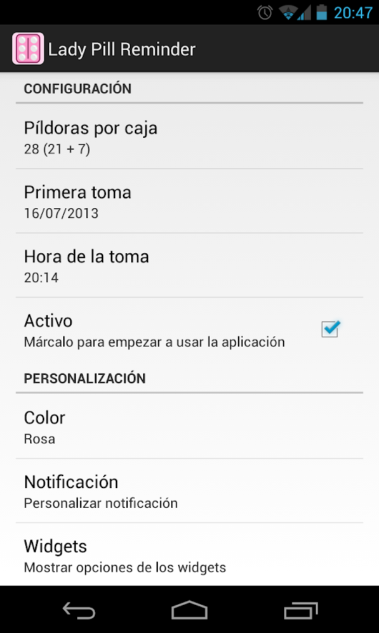 La cual te va a recordar todos los días (a excepción de que no tengas batería en el móvil), que debes tomar tu píldora.